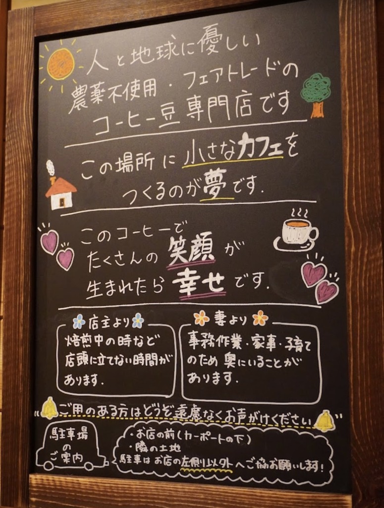 私たち夫婦の想いと、お店のご案内を書いたボードをつけました。