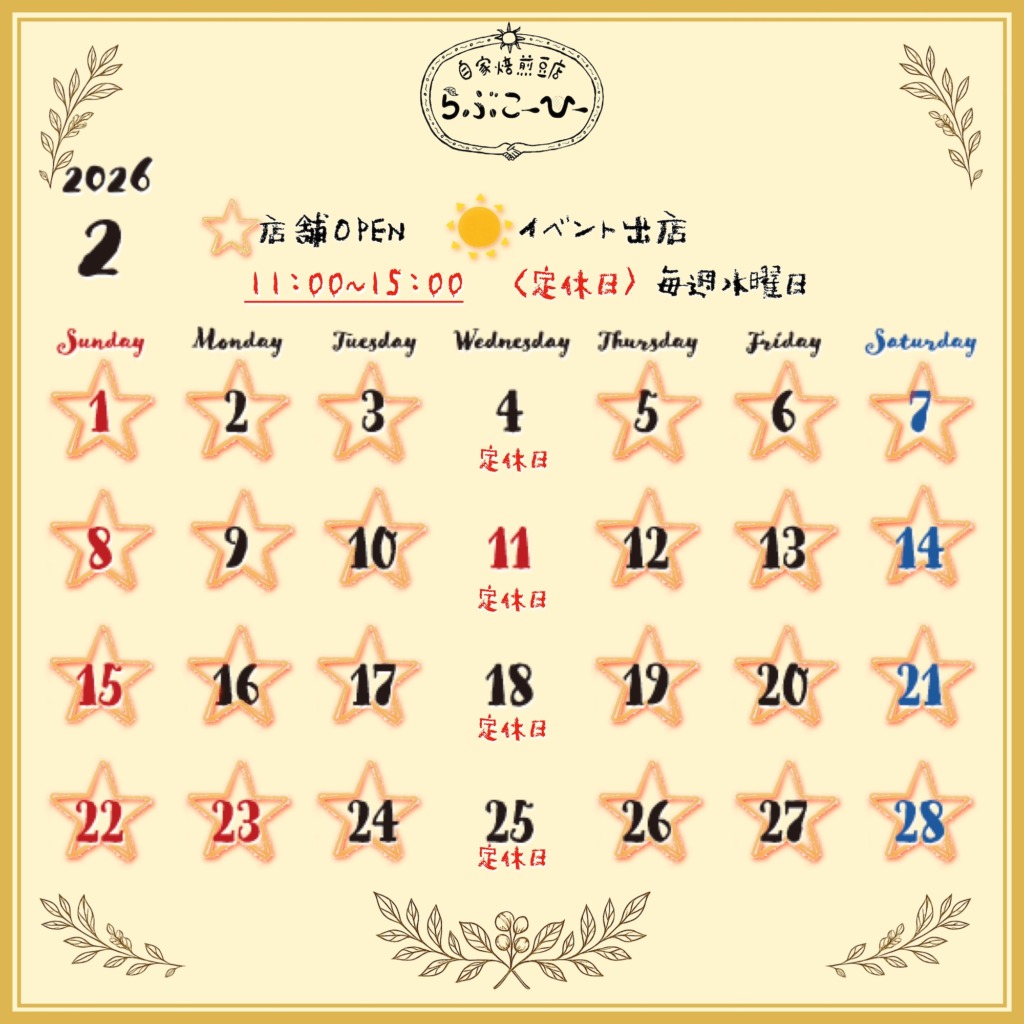 2026.02.05 【2月の営業日カレンダー🌱✨】 いつもありがとうございます☺️2月の営業カレンダーです! 1月も店頭販売や行商販売、イベントにてたくさんの方にお会いできて嬉しかったです✨ありがとうございました☺️🌈2月も水曜定休でお待ちしております! 〜2月のイベント〜 今のところありません! これからも皆様に美味しくて地球にも人にも優しいコーヒーを届けられるように頑張りますのでどうぞよろしくお願いします😊✨