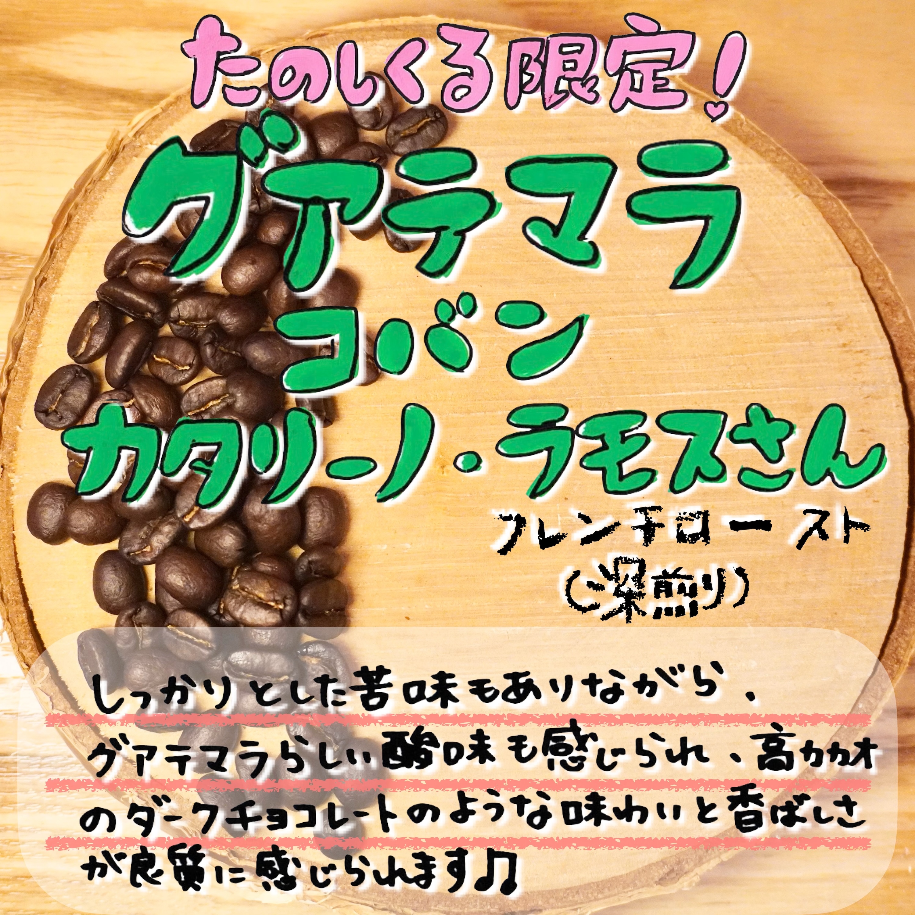 しっかりとした苦味もありながら、グアテマラらしい酸味も感じられ、高カカオのダークチョコレートの様な味わいと香ばしさが良質に感じられます♪