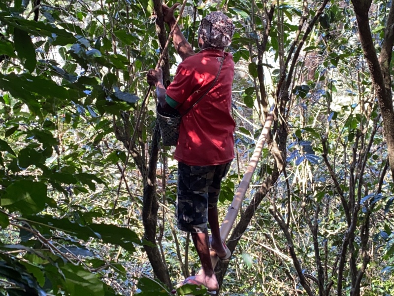 1本の樹からの収穫量はとても少なく、樹高も高いため、木を引っ張って足で押さえたり、木に登って収穫を行います。