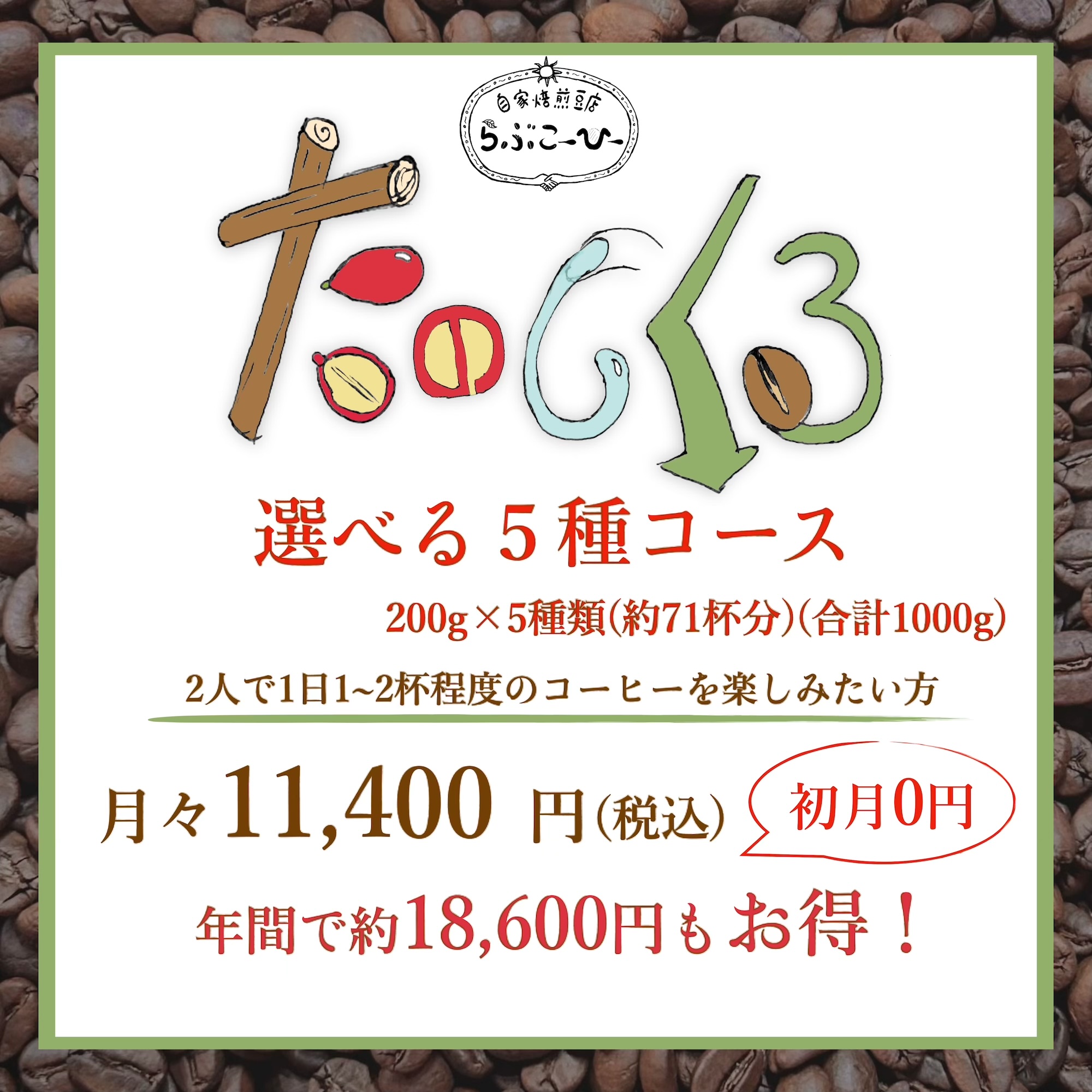 定期便「たのしくる」楽しいが届く! らぶこーひーの定期便 5種コース 1000g
