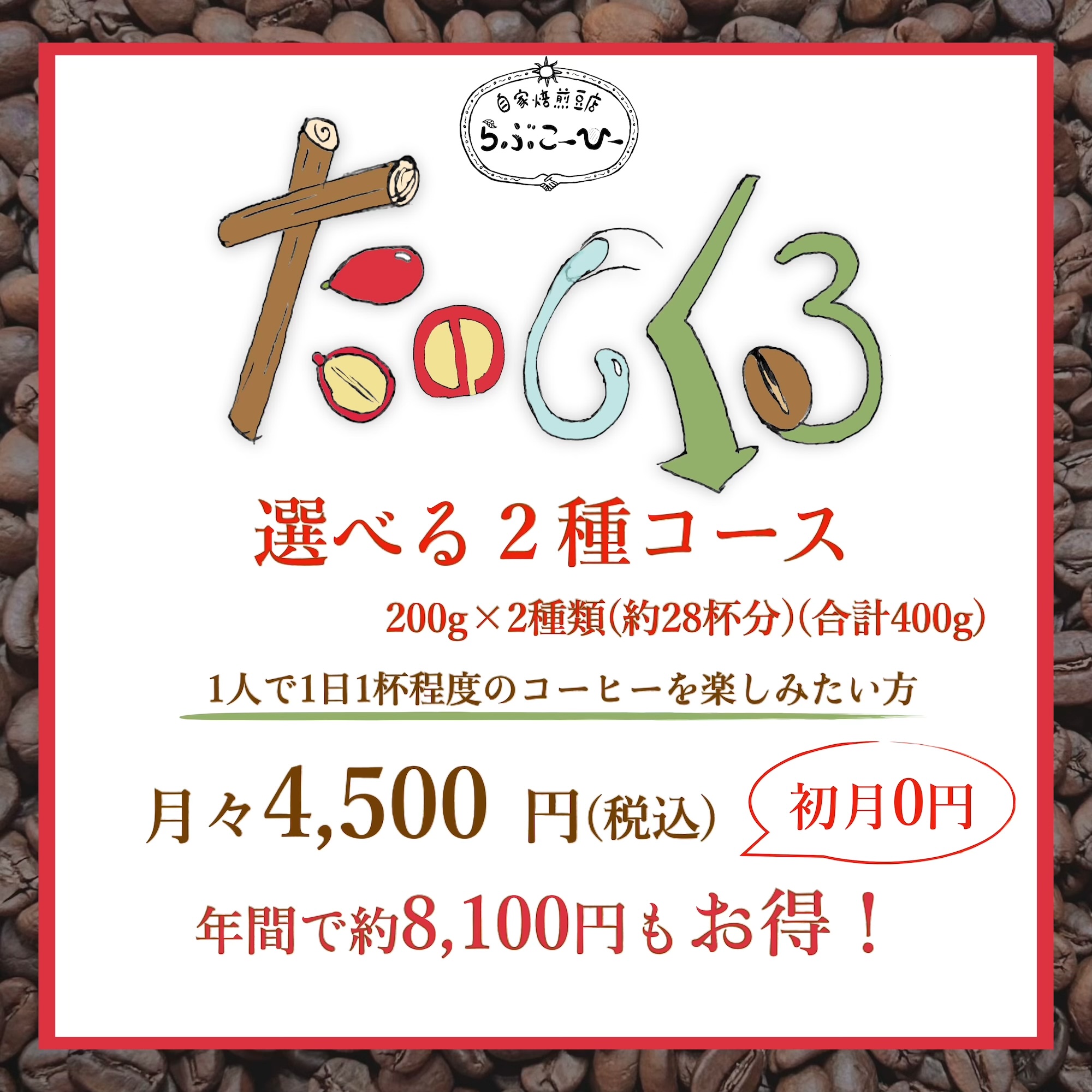 定期便「たのしくる」楽しいが届く! らぶこーひーの定期便 2種コース 400g